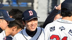 [OSEN=잠실, 이대선 기자] 15일 오전 서울 잠실야구장에서 2020년 두산베어스 창단기념식 및 포토데이 행사가 열렸다.두산 허경민이 동료들과 인사를 나누고 있다. /sunday@osen.co.kr