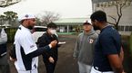 [OSEN=미야자키(일본), 이대선 기자] 29일 오후 (한국시간) 일본 미야자키 사이토구장에서 두산 베어스의 스프링캠프가 열렸다.두산 페르난데스가 취재진과 인터뷰 중인 알칸타라에게 다가가 마이크를 드는 포즈를 취하고 있다. /s