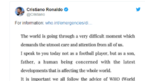 [OSEN=이인환 기자] "세계보건기구(WHO)와 정부기관의 조언을 따르는 것이 무엇보다 중요"영국 '더 선'은 14일(한국시간) "크리스티아누 호날두는 코로나 바이러스에 대해 환자들에게는 위로를 보건 당사자들에게는 감