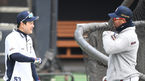 [OSEN=잠실, 곽영래 기자] 19일 오후 서울 잠실야구장에서 두산 베어스가 훈련을 진행했다.두산 최주환이 페르난데스가 이야기를 나누고 있다. /youngrae@osen.co.kr