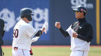 [OSEN=수원,박준형 기자] 24일 오후 경기도 수원 kt위즈파크에서 kt위즈 선수단의 자체 청백전이 진행됐다.1회말 1사 1루 강백호가 선취 1타점 2루타를 날리고 박기혁 코치와 하이파이브를 하고 이/ㅆ다/ soul1014@osen.co.kr