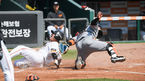 [OSEN=대전,박준형 기자] 25일 오후 대전 한화생명이글스파크에서 한화 이글스 자체 청백전이 진행됐다.2회말 청팀 노시환의 선취 1타점 적시 2루타때 1루 주자 최재훈이 홈쇄도해 세이프되고 있다. / soul1014@osen.co.kr