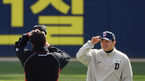 [OSEN=잠실, 곽영래 기자] 21일 오후 서울 잠실야구장에서 열린 LG 트윈스와 두산 베어스의 연습경기가 열렸다.5회말 종료 후 클리닝 타임때 두산 류지혁이 외야에서 몸을 풀던 LG 선수들과 이야기를 나누고 있다. /youngrae@osen.co.kr