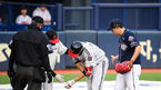 [OSEN=잠실, 지형준 기자] 1일 오후 서울 잠실야구장에서 두산 베어스와 LG 트윈스의 연습경기가 열렸다.2회말 1사에서 두산 이용찬이 LG 이형종에 사구를 허용하며 미안함을 표시하고 있다. /jpnews@osen.co.kr