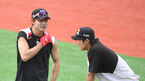 [OSEN=수원,박준형 기자] 2020 KBO리그 정규시즌 개막전 이틀 앞둔 3일 오후 수원 KT위즈파크에서 KT위즈의 자체훈련이 진행됐다.로하스가 배정대 앞에서 타격자세를 보이고 있다. / soul1014@osen.co.kr