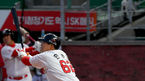 [OSEN=잠실, 조은정 기자] 6일 오후 서울 잠실야구장에서 ‘2020신한은행SOLKBO리그’ LG 트윈스와 두산 베어스의 경기가 열렸다.3회초 1사 3루에서 두산 최주환이 투런 우중간 홈런을 때려낸 뒤 더그아웃에서 동료들의 축하를