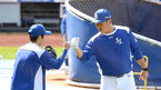 [OSEN=대구, 곽영래 기자] 6일 오후 대구 삼성라이온즈파크에서 '2020 신한은행 SOL KBO리그' 삼성 라이온즈와 NC 다이노스의 경기가 열린다.삼성 조동찬 코치가 훈련을 마친 김지찬과 주먹 인사를 나누고 있다. /youngrae@osen.co.kr