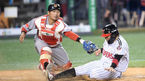 [OSEN=잠실, 지형준 기자] 12일 오후 서울 잠실야구장에서‘2020신한은행SOLKBO리그’ LG 트윈스와 SK 와이번스의 경기가 열렸다.4회말 1사 1,2루에서 LG 유강남이 김현수의 1타점 적시타에 홈에서 SK 이현석에 앞서 세이프되고 있