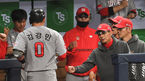 [OSEN=고척,박준형 기자] 19일 오후 서울 고척스카이돔에서 KBO리그 키움 히어로즈와 SK 와이번스의 경기가 진행됐다.7회초 SK 선두타자 김강민이 솔로홈런으르 날리고 염경엽 감독의 축하를 받고 있다 / soul1014@osen.co.kr