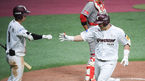 [OSEN=고척,박준형 기자] 19일 오후 서울 고척스카이돔에서 KBO리그 키움 히어로즈와 SK 와이번스의 경기가 진행됐다.8회말 키움 선두타자 박동원이 솔로홈런을 날리고 홈을 밟은뒤 전병우와 하이파이브를 하고 있다 / soul1014@osen.co.