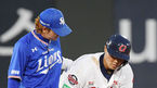 [OSEN=부산, 민경훈 기자] 28일 부산 사직야구장에서 ‘2020 신한은행 SOL KBO리그’ 롯데 자이언츠와 삼성 라이온즈의 경기가 열렸다.3회말 2사 주자 1루 롯데 한동희가 좌익수 왼쪽 2루타를 날린 후 삼성 2루수 김상수와 얘기