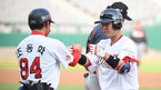 [OSEN=문학,박준형 기자]30일 오후 인천SK행복드림구장에서 KBO리그 SK 와이번스와 한화 이글스의 경기가 진행됐다.2회말 1사 1루 SK 이흥련이 안타를 날리고 조동화 1루 코치와 하이파이브를 하고 있다. SK 이적 첫 안타./ soul1014@osen.co