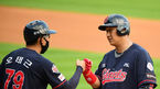 [OSEN=잠실, 지형준 기자] 30일 오후 서울 잠실구장에서 KBO리그 두산 베어스와 롯데 자이언츠의 경기가 열렸다.3회초 1사1,2루에서 롯데 이대호가 1타점 적시타를 날리고 오태근 코치와 주먹을 맞대고 있다. /jpnews@osen.co.kr