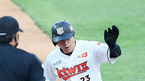 [OSEN=잠실,박준형 기자] 3일 오후 서울 잠실구장에서 KBO리그 LG 트윈스와 삼성 라이온즈의 경기가 진행됐다.2회말 LG 선두타자 정근우가 안타를 날리고 안녕 세리머니를 하고 있다. 이 안타로 정근우는 KBO 27번째 통산 2600루타를