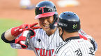 [OSEN=잠실,박준형 기자] 3일 오후 서울 잠실구장에서 KBO리그 LG 트윈스와 삼성 라이온즈의 경기가 진행됐다.2회말 LG 선두타자 정근우가 안타를 날리고 김호 코치와 하이파이브를 하고 있다. 이 안타로 정근우는 KBO 27번째 통산 260