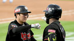 [OSEN=대전, 곽영래 기자] 13일 오후 대전 한화생명이글스파크에서 '2020 신한은행 SOL KBO리그' 한화 이글스와 두산 베어스의 경기가 열렸다.2회말 1사 한화 노시환이 솔로 홈런을 때린 뒤 최재훈과 기뻐하고 있다. /youngrae@osen.co.kr