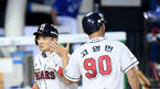 [OSEN=잠실, 조은정 기자] 17일 오후 서울 잠실야구장에서 ‘2020신한은행SOLKBO리그’ 두산 베어스와 삼성 라이온즈의 경기가 열렸다.6회말 2사 두산 최주환이 추격의 우월 솔로 홈런을 때린 뒤 홈에서 고영민 코치와 하이파