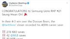 [OSEN=손찬익 기자] 뉴욕 양키스 산하 싱글A팀 찰스턴 리버독스가 '끝판대장' 오승환(삼성)의 한미일 통산 400세이브 달성을 축하하는 메시지를 보냈다.오승환은 지난 16일 잠실 두산전에서 4-3으로 앞선 9회 마운드에 올랐다. 선두