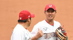 [OSEN=인천, 최규한 기자] 17일 오후 인천 SK 행복드림구장에서 ‘2020 신한은행 SOL KBO리그’ SK 와이번스와 KT 위즈의 경기가 열렸다.2회말 1사 1루 상황 SK 이흥련이 안타를 날리고 1루에 안착해 조동화 코치와 인사를 나누고 있