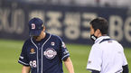 [OSEN=잠실, 곽영래 기자] 19일 오후 서울 잠실야구장에서 '2020 신한은행 SOL KBO리그' LG 트윈스와 두산 베어스의 경기가 열렸다.9회말 1사 1루 두산 이형범이 LG 신민재의 강습 타구를 발에 맞은 뒤 통증을 호소하고 있다. /youngrae@osen.c