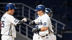[OSEN=창원, 민경훈 기자] 28일 오후 창원 NC파크에서 ‘2020 신한은행 SOL KBO리그’ NC 다이노스와 두산 베어스의 경기가 열렸다.4회초 1사 주자 1,2루 두산 최주환이 2타점 적시 2루타를 날린 후 2루에서 고영민 코치와 하이파이