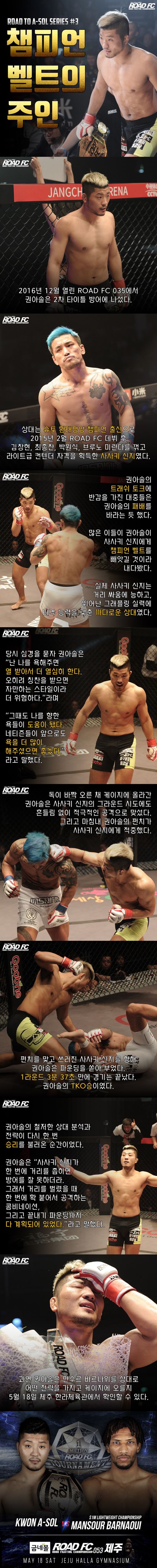 둘의 맞대결에는 아시아 최대 액수의 상금과 권아솔의 라이트급 챔피언 벨트가 걸려있다. ROAD FC 역사에 한 획을 그을 대결을 앞두고, 권아솔의 일대기를 ‘ROAD TO A-SOL’ 시리즈를 통해 되짚어 본다.