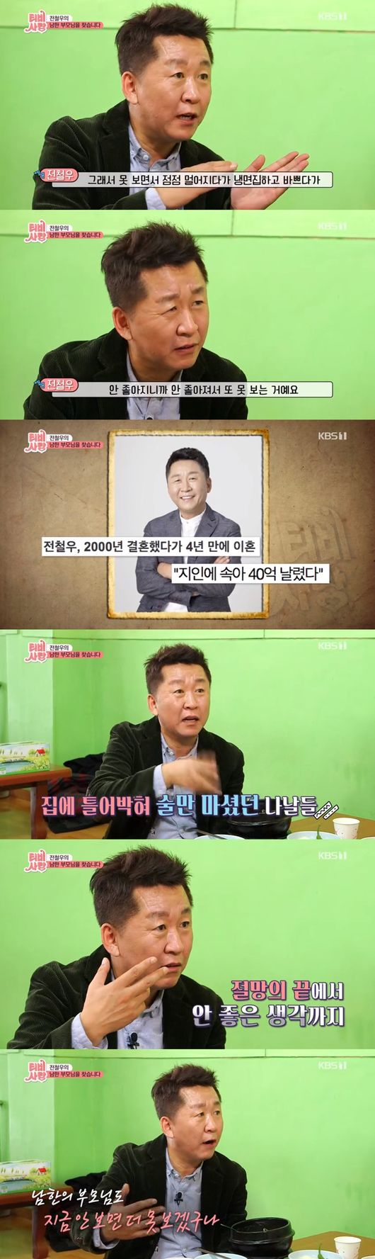 이어 전철우는 "당시 S방송사에서 많이 일해서 집을 등촌동으로 이사를 갔다. 방송 스케줄도 늘어나고 그러다보니 연락도 드리지 못하게 됐다"라고 말했다. 이후 전철우는 사업을 하면서 사기도 당하게 됐고 실의에 빠져 극단적인 생각도 한 적이 있다고 말했다.