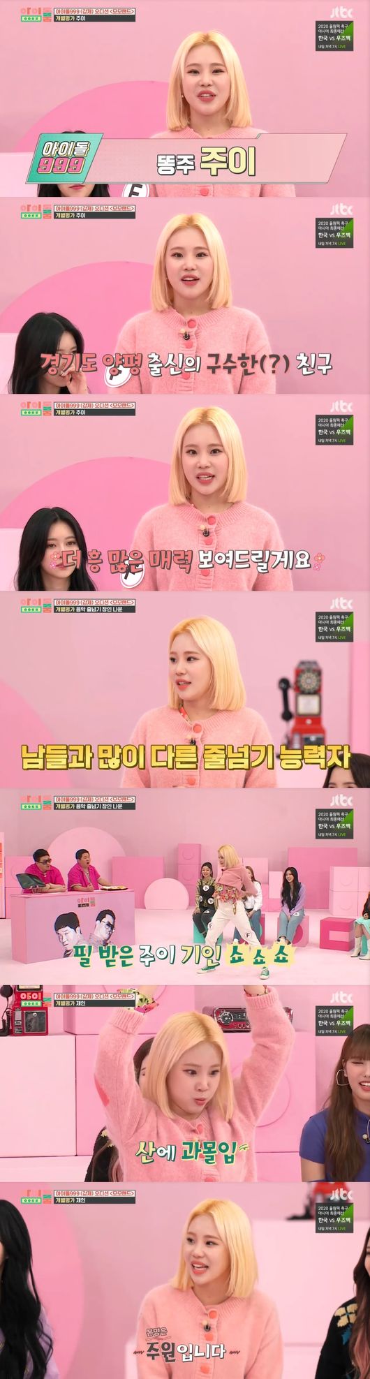 마지막으로 주이는 "금수저 아니다"며 해명하면서 "나는 경기도 양평에서 자란 구수한 친구"라 소개해 웃음을 안겼다. 그러면서 승부욕이 강하다고 장점을 어필, "더 흥 많은 매력 보여드리겠다"며 멤버들과 대결을 펼쳤다.