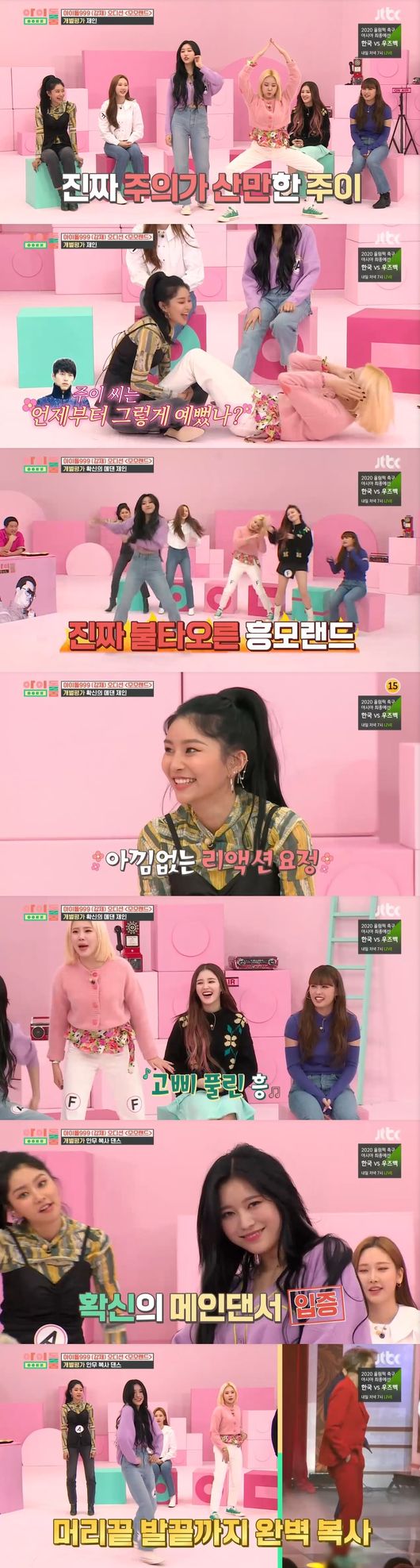 계별 평가를 시작했다. 리더 혜빈은 자신이 투머치 걸이라며 소개하면서 과한 캐릭터를 사수해 웃음을 안겼다. 이어 특유의 '메롱어'를 선보이면서 주이와 공기반 소리반으로 대화를 나눠 배꼽을 잡게 했다.