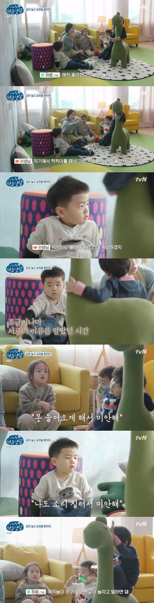 "나한테 지금 나쁜말 하고 있네 반말했네"라는 요한의 말에 하람이 "내가 여기서 나이 제일 많은데 나한테 반말이네"라고 했다. 반면에 은성은 "나 여기 들어와도 돼요?" 라는 존댓말로 유연하게 합석에 성공했다. 결국 선생님의 중재로 사과가 이어졌고, 아이들은 서로 서운했던 점을 털어 놨다. /anndana@osen.co.kr