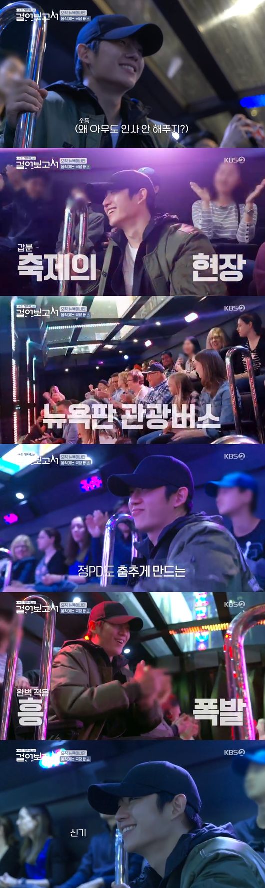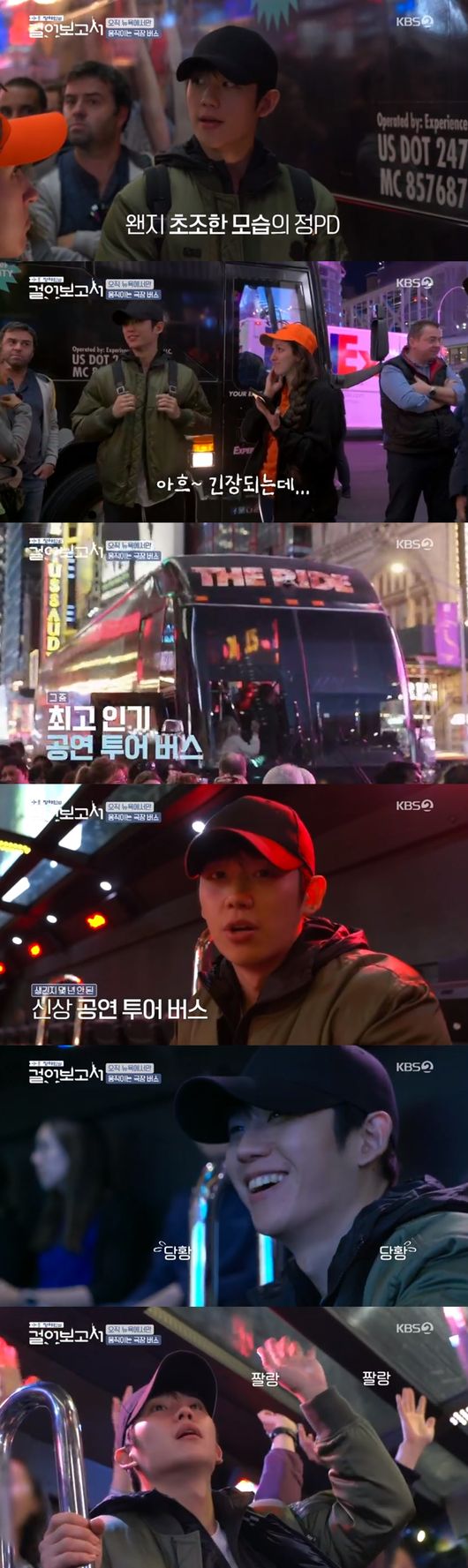 14일에 방송된 KBS2TV '정해인의 걸어보고서'에서는 정해인이 뉴욕의 공연 투어 버스를 타고 관람에 나서는 모습이 그려졌다.