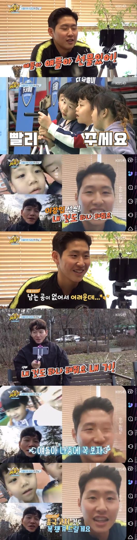 이어 종국은 경기를 잘 보고 있는 팬으로 강인에게 이야기를 전하려 애썼지만, 아이들이 서로 보겠다고 핸드폰을 들고 싸우는 통에 소리가 들리지 않자 강인이 "애들 때문에 안들려요. 애들아 조용히 좀 해줄래?" 라고 했다. 이에 종국이 "이강인 선수도 예전에 그랬을 거예요"라고 했고, 과거 유상철 선수에게 장난을 치는 강인의 모습이 흘러나왔다.