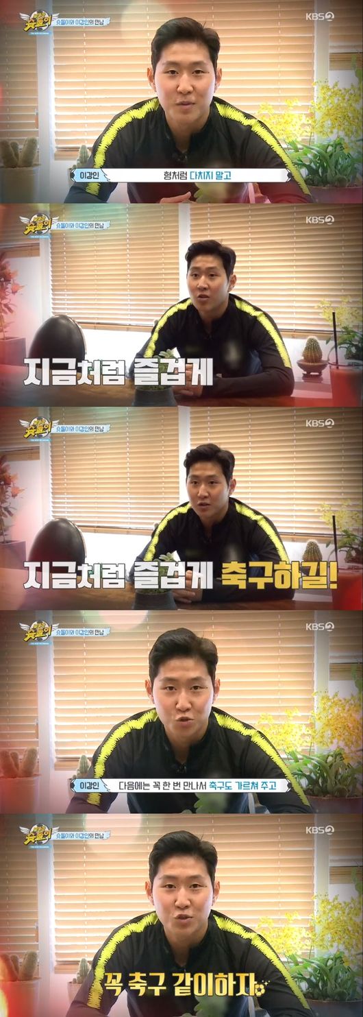 이어 그는 "저도 많이 아쉽네요. 같이 할 수 있었으면 좋았을텐데"라는 강인. 파주 트레이닝 센터에서 재활에 전념중이라 슛돌이들과 함께 할 수 없음을 설명하는 자막이 이어졌다.