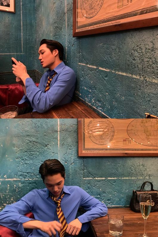 특히 카이는 블루 컬러 셔츠와 옐로우, 레드가 사선으로 포인트된 넥타이를 매치하면서 우월한 패션 센스를 뽐냈다.
