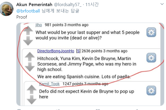 한 팬은 "데 브라위너는 달려가서 봉준호 감독에게 차기작에 대한 아이디어를 어시스트할 것"라거나 "브라위너가 알아서 접시에 요리를 다 세팅할 것"이라고 들뜬 반응을 보였다.