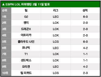 ESPN은 11일 오전(이하 한국시간) 2020시즌 스프링 두 번째 리그 오브 레전드(이하 LOL) e스포츠 프로팀 파워랭킹을 공개했다. ‘LOL 유로피안 챔피언십(이하 LEC)’의 최강팀 G2가 2주 연속 1위를 지킨 가운데 LCK 스프링 개막주차서 2전 전승을 기록한 젠지가 LCK팀들 중 최상위인 2위를 기록했다.