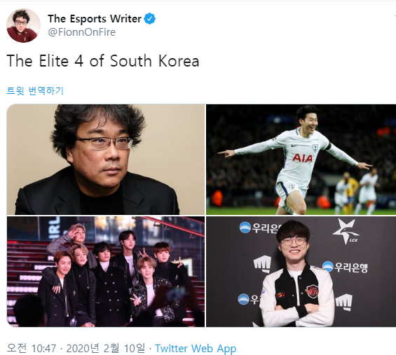 미국 'ESPN'의 타일러 어즈버거는 지난 10일(한국시간) 한국을 대표하는 4인방으로 손흥민을 포함해 봉준호 감독-방탄소년단(BTS)-페이커(본명 이상혁)을 거론했다.
