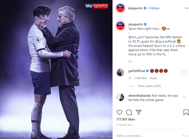 영국 '스카이스포츠'는 경기 후 무리뉴 감독과 손흥민의 관계를 조명했다. 이 매체는 무리뉴 감독이 손흥민의 볼을 잡고 기뻐하는 포스터로 만들기도 했다.