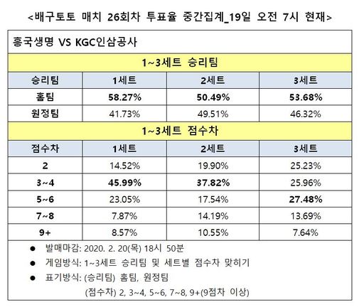 2019-2020시즌 V리그 대상 배구토토 매치 26회차 중간집계 결과