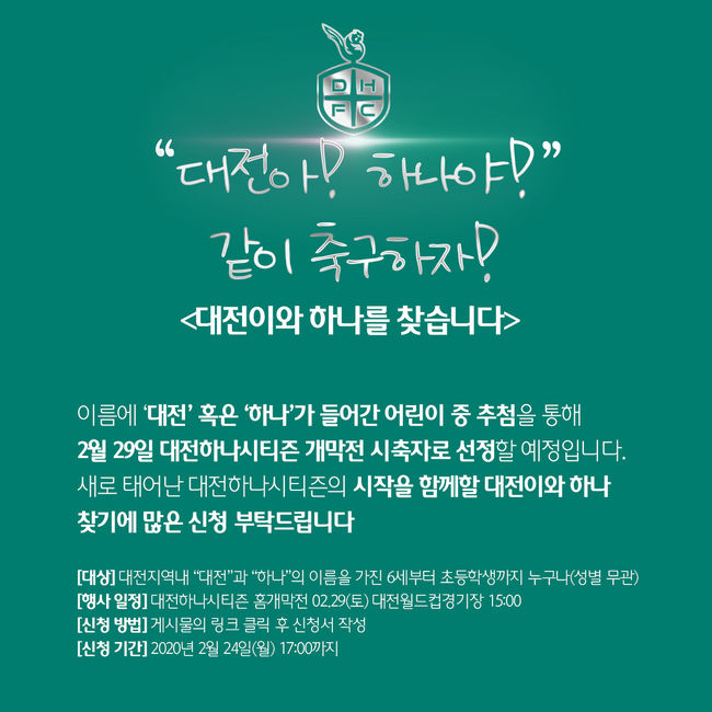 대상은 대전 거주자 중, 이름에 ‘대전’ 또는 ‘하나’가 들어간 6세 ~ 초등학생까지의 어린이로 온라인을 통해 사전 신청을 받으며 2020 대전하나시티즌 시즌권 구매자에게는 우선 참가 신청 권한이 주어진다.