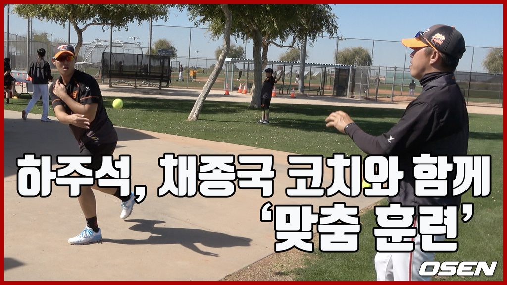 한화 하주석이 채종국 코치의 지도를 받으며 맞춤 훈련을 진행하고 있다.