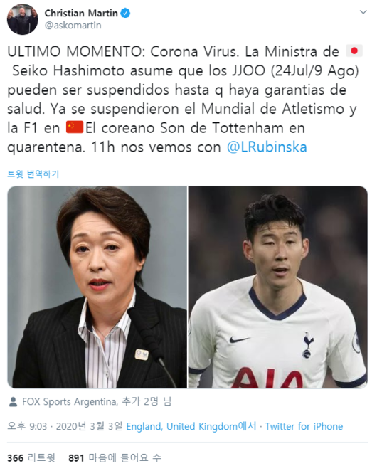 마틴 기자는 유럽 축구에서 활약하고 있는 손흥민 역시 코로나 바이러스로 피해를 받고 있다고 언급했다. 그는 "손흥민 역시 코로나 바이러스로 인해 영국으로 복귀해서 격리된 상황"이라고 지적했다.