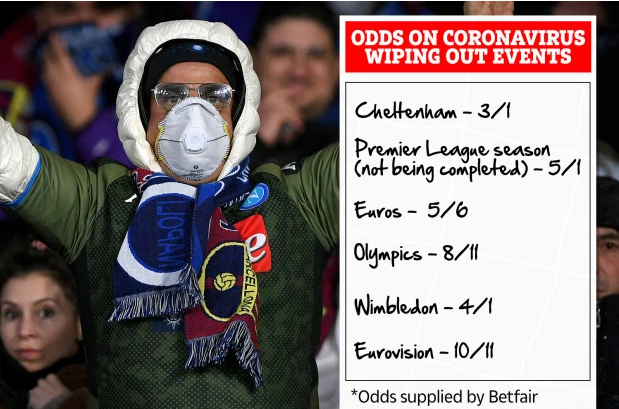 영국 '더 선'은 4일(한국시간) "코로나 바이러스의 공포가 전 세계로 확산되면서 도박사들은 유로 2020와 도쿄 올림픽를 비롯한 스포츠 이벤트의 취소 가능성을 더 올린 상태다"라고 보도했다.
