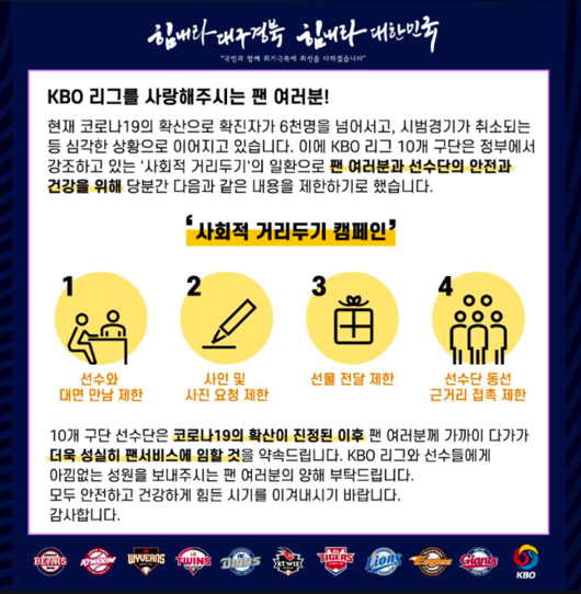 KBO리그 10개 구단은 최근 회의를 통해 ‘사회적 거리두기 캠페인’ 일환으로 선수단과 팬들의 접촉 제한을 확정했다. 코로나19의 확산으로 확진자가 급속도로 늘어나고 있는 가운데, 팬과 선수단의 안전과 건강을 위한 방침이었다.