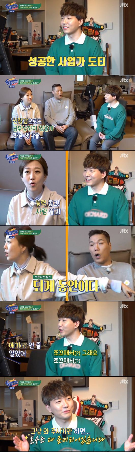 이에 놀란 장윤정은 "신랑감으로 인기 많을 것 같은데.. 혹시 지금 나이가 몇이냐"라고 물었고  도티는 "35살이고 결혼 적령기다. 저도 결혼하고 싶다. 그냥 몸만 오시면 된다"라며 공개구혼에 나섰다. 이에 세 사람은 "정말 동안이다"라며 놀라워했고 도티는 자신의 키를 재면서 쪼만해서 그런다고 말해 웃음을 자아냈다.