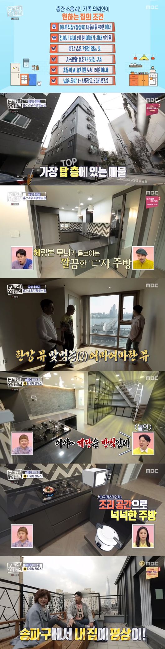 이날 의뢰인은 7살, 5살 두 아들이 있다. 아이들 밝게 키울 수 있는 층간 소음 걱정 없는 집을 찾게 됐다. 남편의 직장이 가로수길인데자차라 괜찮고 저는 잠실에 근무한다. 잠실역 40분 이내,방은 3개 이상, 냉장고 2대가 들어가는 넓은 주방이 있는 매물을 원한다고 밝혔다. 이어 전세가 최대 6억원, 매매 9억원까지 가능하다고 말했다.