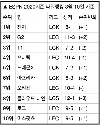 ESPN은 10일 오전(이하 한국시간) 2020년 스프링시즌 6번째 LOL e스포츠 프로팀 파워랭킹을 공개했다. 지난 주 리그를 재개한 LPL이 순위 집계에서 빠졌지만, LCK는 TOP 10안에 젠지, T1, 드래곤X, 아프리카 등 4개 팀을 포진시켰다.
