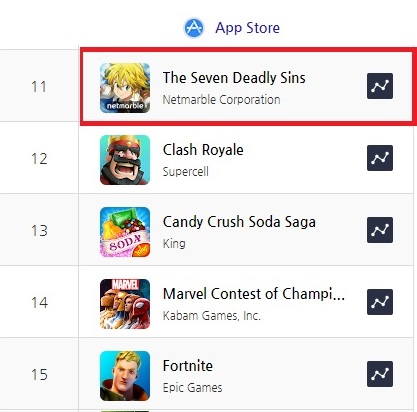 지난 3일 170여 개국에서 출시된 ‘일곱 개의 대죄: 그랜드 크로스’는 출시 일주일만에 미국 애플 앱스토어 매출 11위에 오르는 기염을 토했다. 모바일 앱 마켓 분석 사이트 모바일인덱스에 따르면, ‘일곱개의 대죄:그랜드 크로스’는 11일 오전 10시 기준 글로벌 빅마켓 중 하나인 미국 애플 앱스토어 매출 순위 11위를 차지하고 있다.