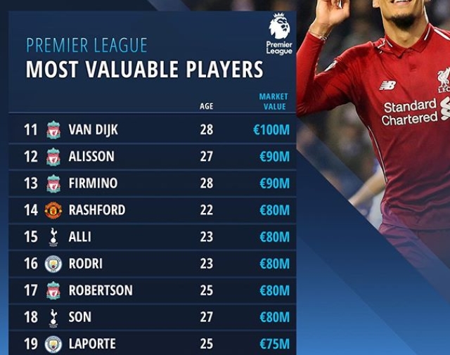 프리미어리그 선수들의 몸 값이 업데이트 됐다. 손흥민(토트넘)은 변화 없었다.