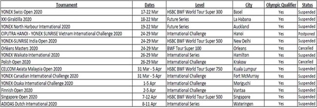 잠정 중단되는 대회는 다음 주 개최예정이었던 ‘2020 스위스오픈’을 비롯 그 다음 주 연속적으로 열리는 인디아 오픈, 말레이시아 오픈, 싱가포르 오픈 등이 포함되며, BWF 3등급 토너먼트도 다수 포함된다.